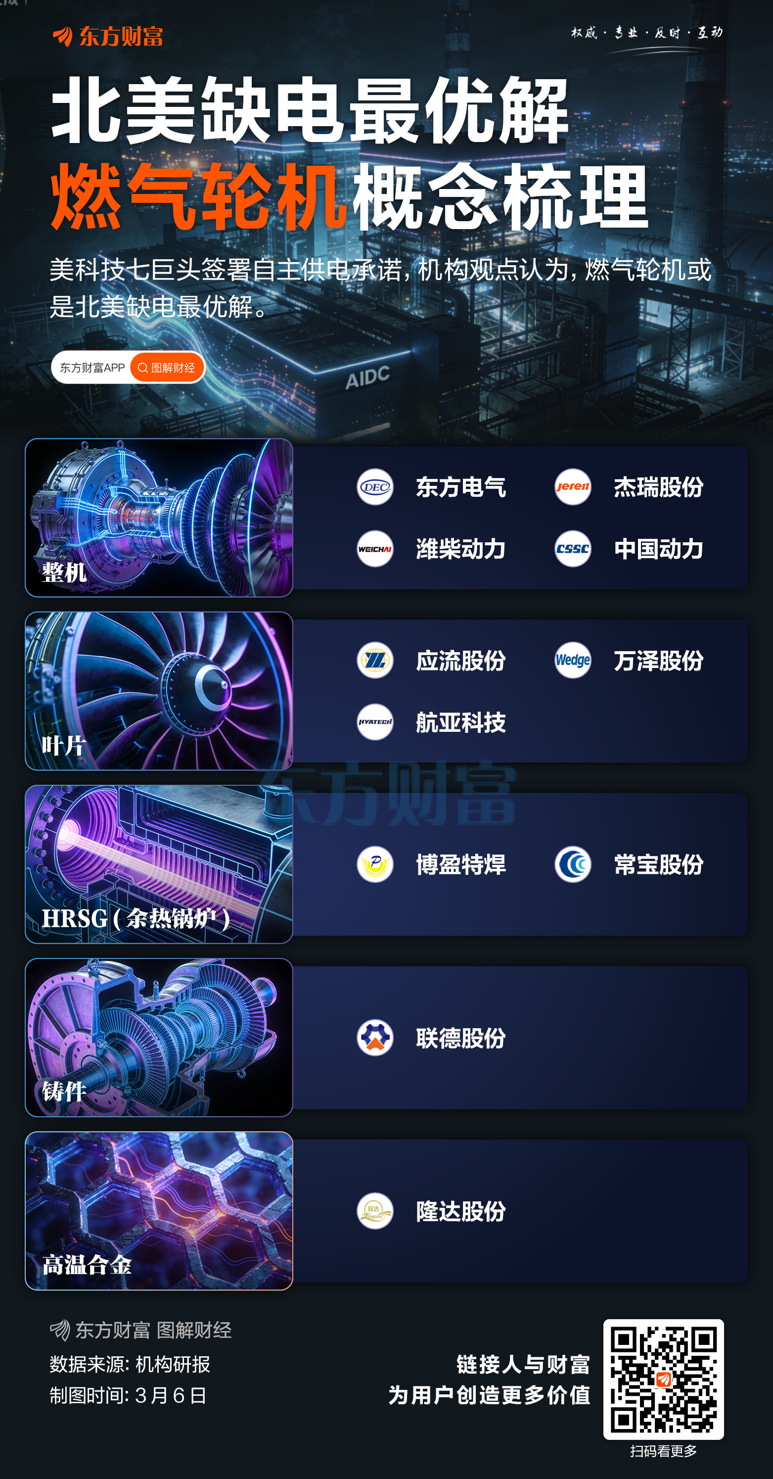 中信建投研报表示,关注整机、叶片、HRSG(余热锅炉)、铸件、高温合金等五大方向的相关标的。