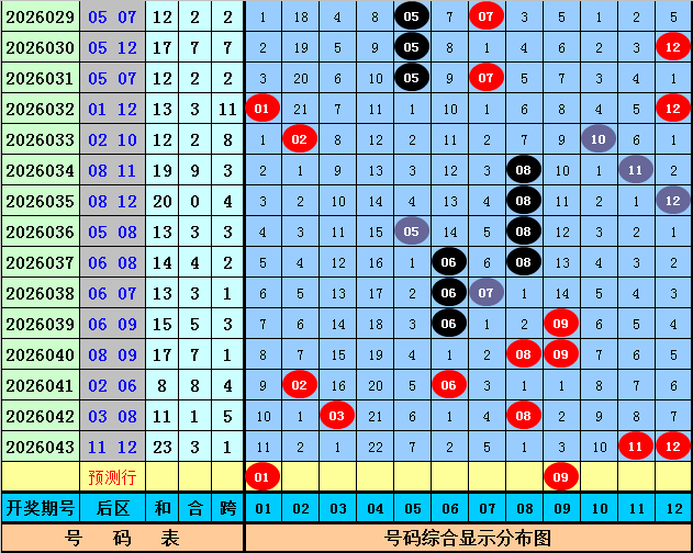 后区上期开出奖号11和12,该组合历史上出现了46次,其下期奖号频次分别为:号码07、12出现11次,02出现10次,04、11出现9次,05出现8次,01、08、09出现6次,06、10出现5次,03出现4次,本期后区参考号码01、05、09、10,精选两码01和09。